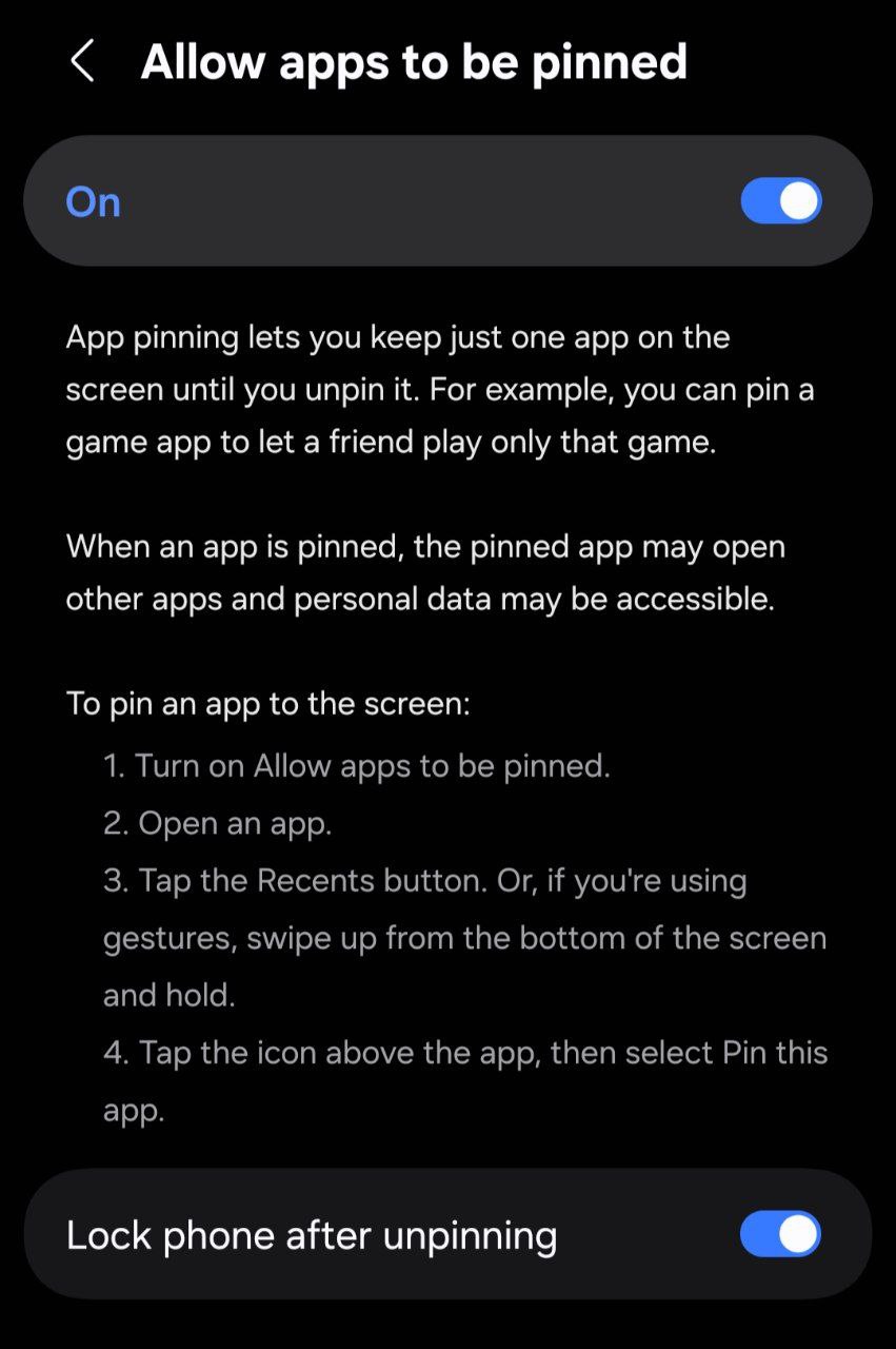 3. Scroll down and tap on App Pinning (or Screen Pinning).